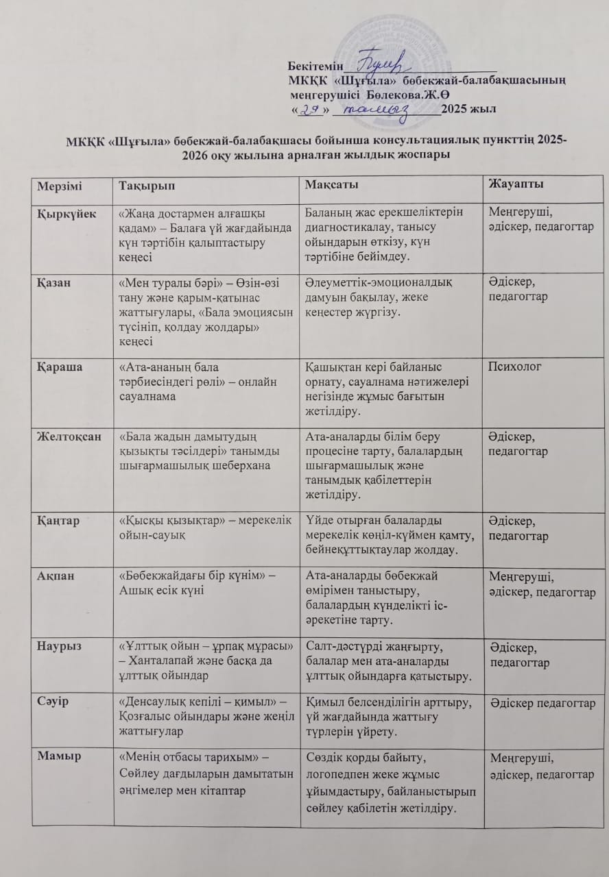 | 1 | Консультациялық пункттің 2023-2024 оку жылына арналған жылдық жоспары |